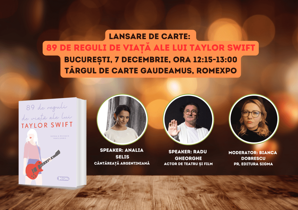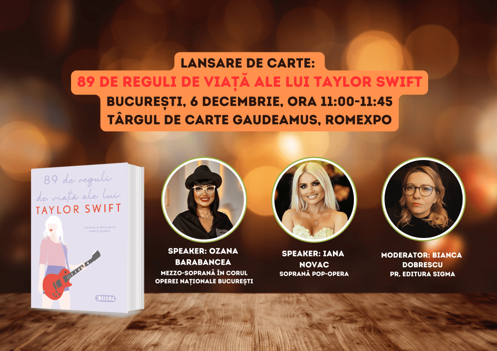 București, 3 decembrie 2024 Cum percep artiștii responsabilitatea socială și influența pe care o au asupra publicului, în special asupra tinerelor generații? Pe 6 și 7 decembrie, editura Sigma vă invită la o dublă lansare de excepție a volumului „89 de reguli de viață ale lui Taylor Swift”, scrisă de Sophia și Michalis Pantelouris, în cadrul Târgului de Carte Gaudeamus. La dezbatere, vor participa nume sonore din mediul cultural: soprana pop-operă Iana Novac, mezzo-soprana Ozana Barabancea, cântăreața argentiniană Analia Selis și actorul Radu Gheorghe.