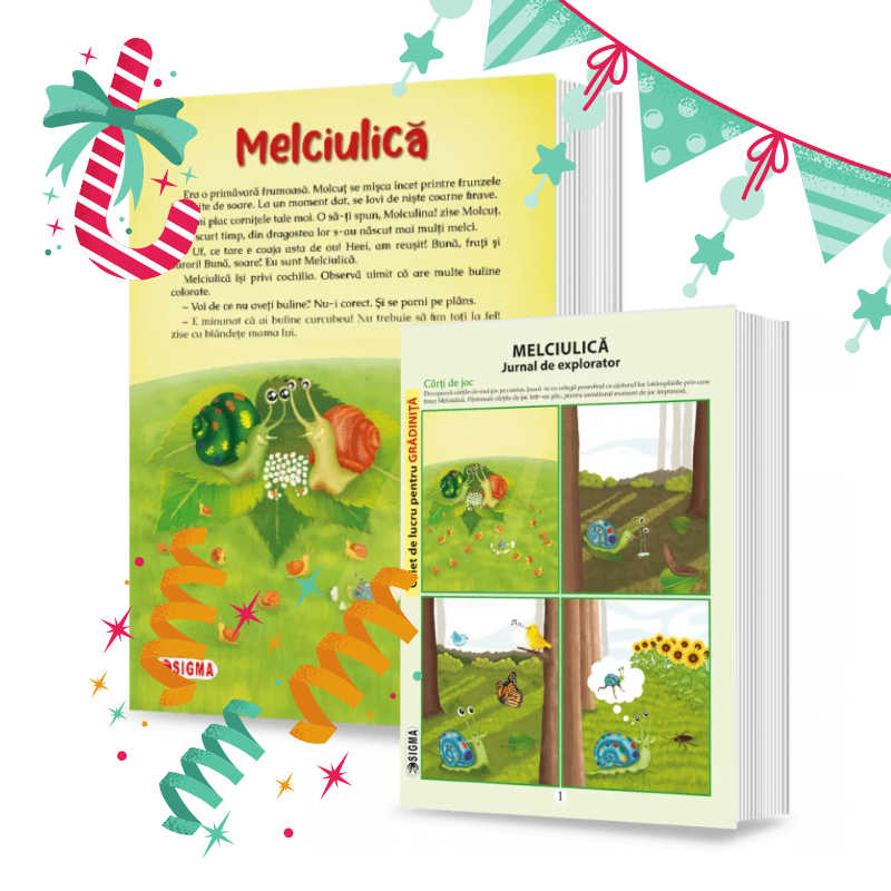 Pachetul Melciulică include cartea uriașă Melciulică și jurnalul de explorator Melciulică, acum la un preț special! Descoperă universul colorat și explorează activitățile distractive din caietul de lucru!